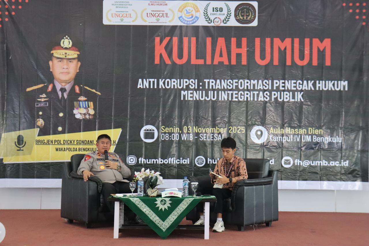 Wakapolda Bengkulu, Brigjen Pol. Dicky Sondani S.I.K., M.H., menjadi narasumber dalam Kuliah Umum dengan tema “Anti Korupsi: Transformasi Penegak Hukum…