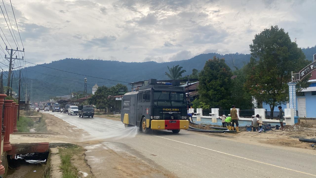 Cegah Risiko ISPA, Polres Aceh Selatan Terjunkan Water Cannon Bersihkan Debu Sisa Banjir