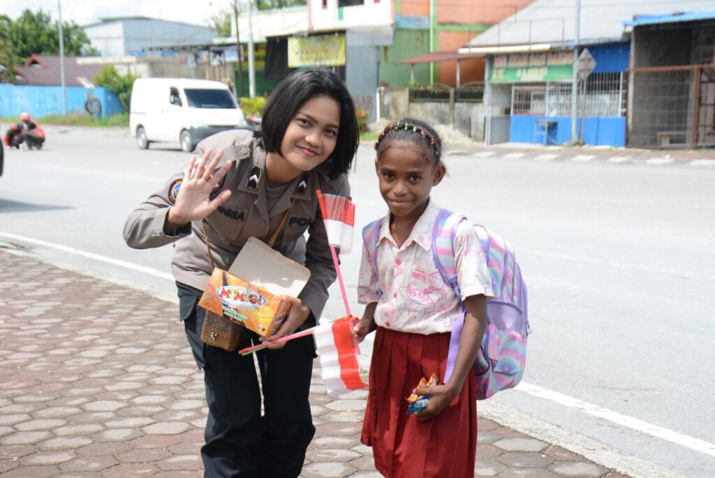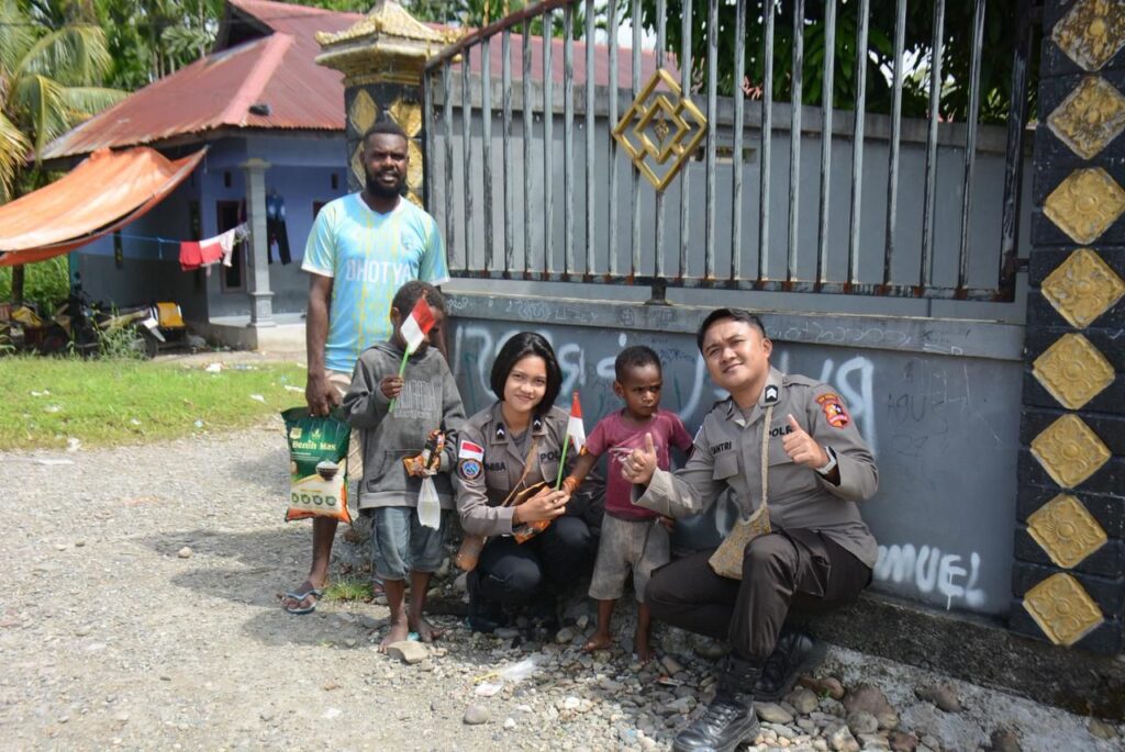 Dalam kegiatan sosial tersebut, Briptu Santriawan bersama Bripda Annisa Mahardika turun langsung menyerahkan bantuan berupa beras kepada warga. Selain sembako, Satgas juga turut membagikan bendera Merah Putih kepada anak-anak sebagai simbol semangat nasionalisme. Keceriaan dan antusiasme terpancar dari wajah mereka saat menerima bendera, menggambarkan rasa bangga dan cinta terhadap Indonesia.
